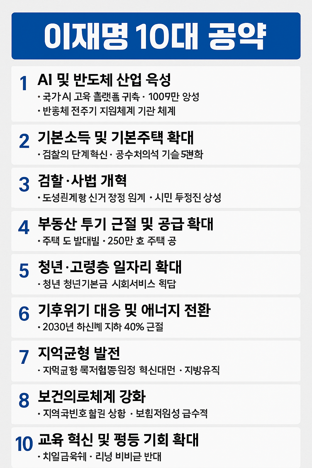 이번 글에서는 이재명 후보가 발표한 10대 핵심 공약을 분야별로 정리해, 유권자들이 한눈에 살펴볼 수 있도록 구성했습니다.